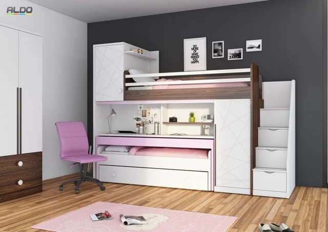 تخت دوطبقه لاین با طراحی هوشمندانه و کاربردی دارای تخت و میز تحریر متحرک باکس کتابخانه ای و کمد و کشو .با بهترین کیفیت و متریال ساخت استحکام بالا و تحمل وزن ٣٠٠کیلو .جنس ملامین دارای رنگ بندی قابلیت تغییروسفارشی سازی
