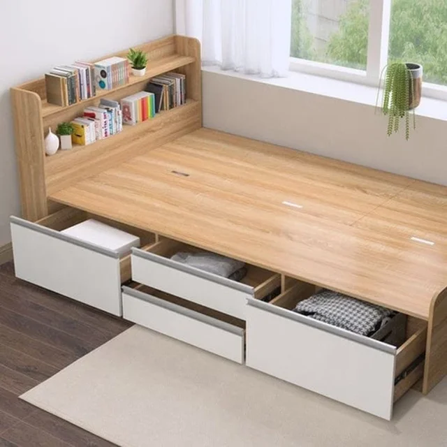 تخت یکنفره مدل ٠٠٨٩ بالای سرتخت دو باکس کتابخانه ای کناره ی تخت دارای ۵کشو بزرگ .زیره ی تخت سه باکس درب دار بزرگ و جادار تعبیه شده مناسب لباس و وسایل اضافه .جنس ملامین دارای رنگ بندی دارای یراق آلات با بهترین کیفیت با دوسال ضمانت