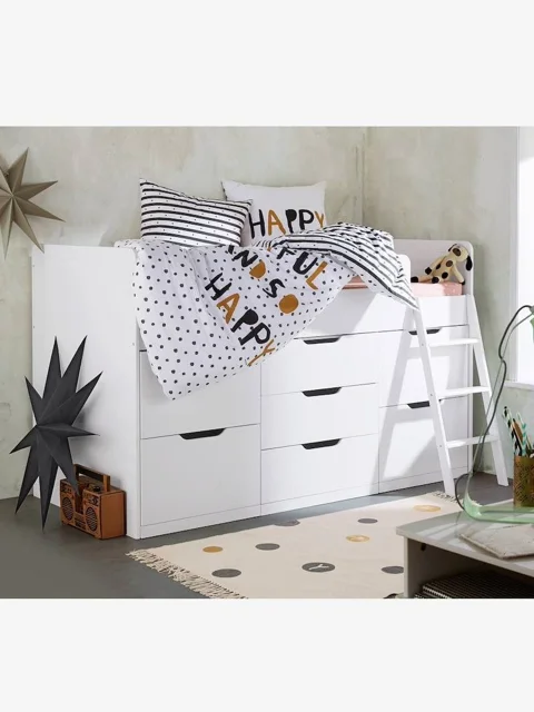 مجموعه خواب یک نفره دارای پله نردبانی و ٧کشو کاربردی برای نظم دهی بیشترمناسب فضاهای کوچک سایز استاندارد ١٨٠در٨٠ جنس ملامین دارای رنگ بندی وسفارشی سازی.